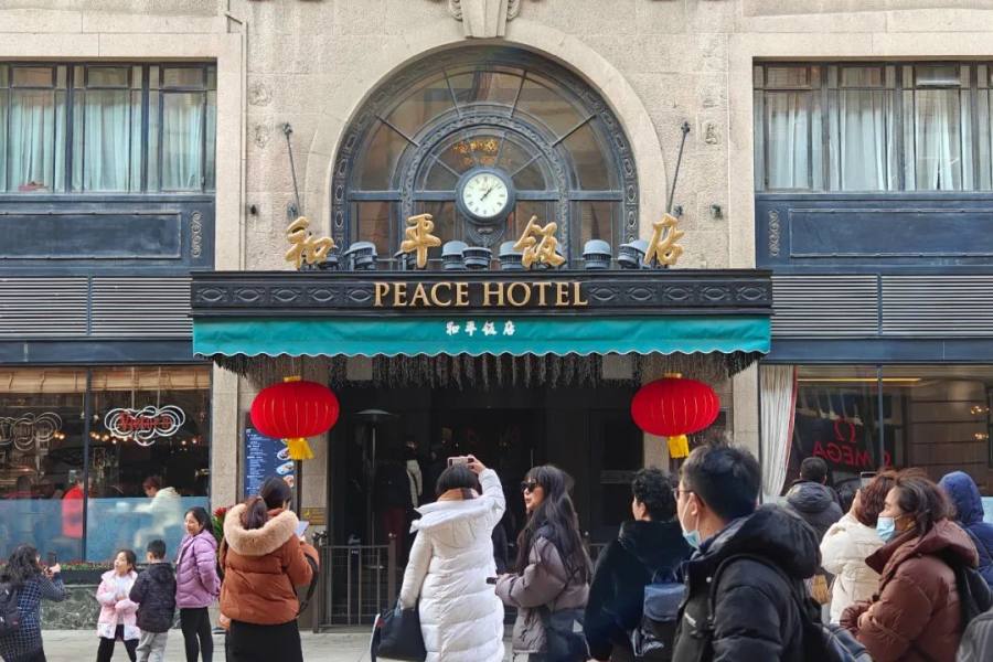 上海和平饭店门头成游客热门打卡地。中新社发 王冈 摄