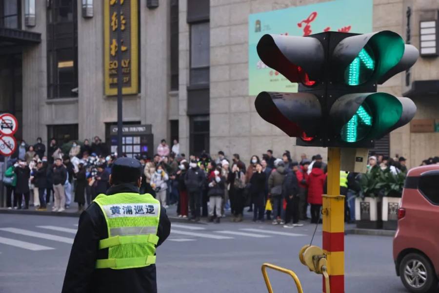 “繁花效应”在上海持续,黄河路增设临时红绿灯确保道路畅通。中新社记者 汤彦俊 摄