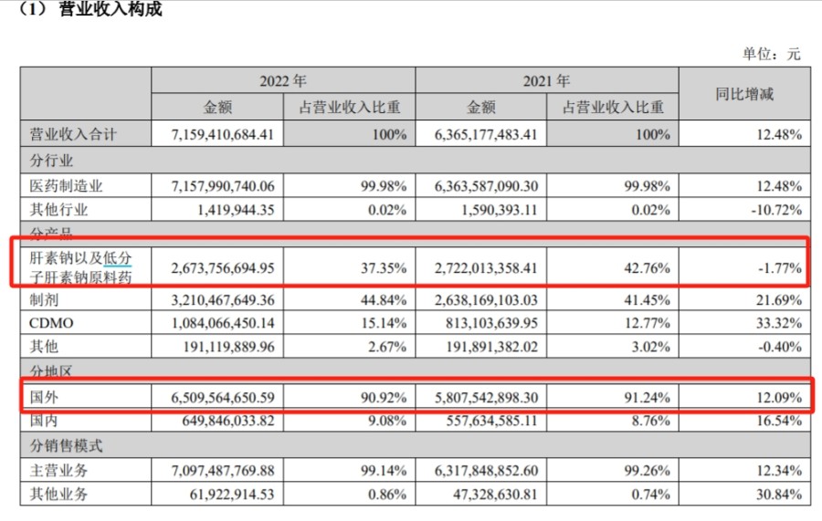2022年报还显示,海普瑞的营业收入主要依赖国外市场,2021年和2022年国外营收占比均在90%以上,从产品来看,肝素钠以及低分子肝素钠原料药2022年营收占营收的比重为37.35%,制剂占44.84%,上述两类产品的毛利率分别为27.74%和35.32%。