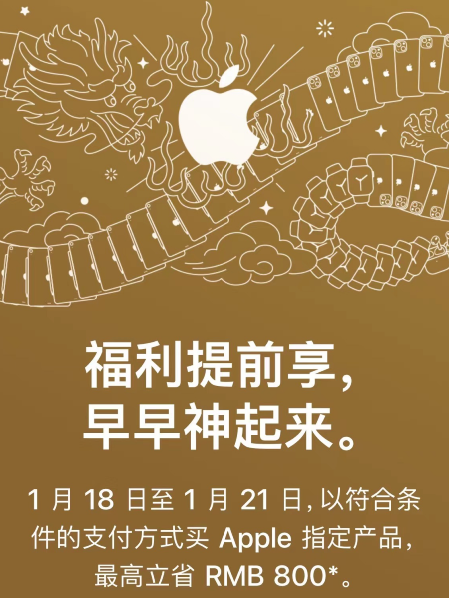 1月15日,Apple(中国大陆)官网上线了活动预告,宣布将于1月18日-21日开启“迎新春限时优惠”,其中提到多款苹果产品将迎来降价。