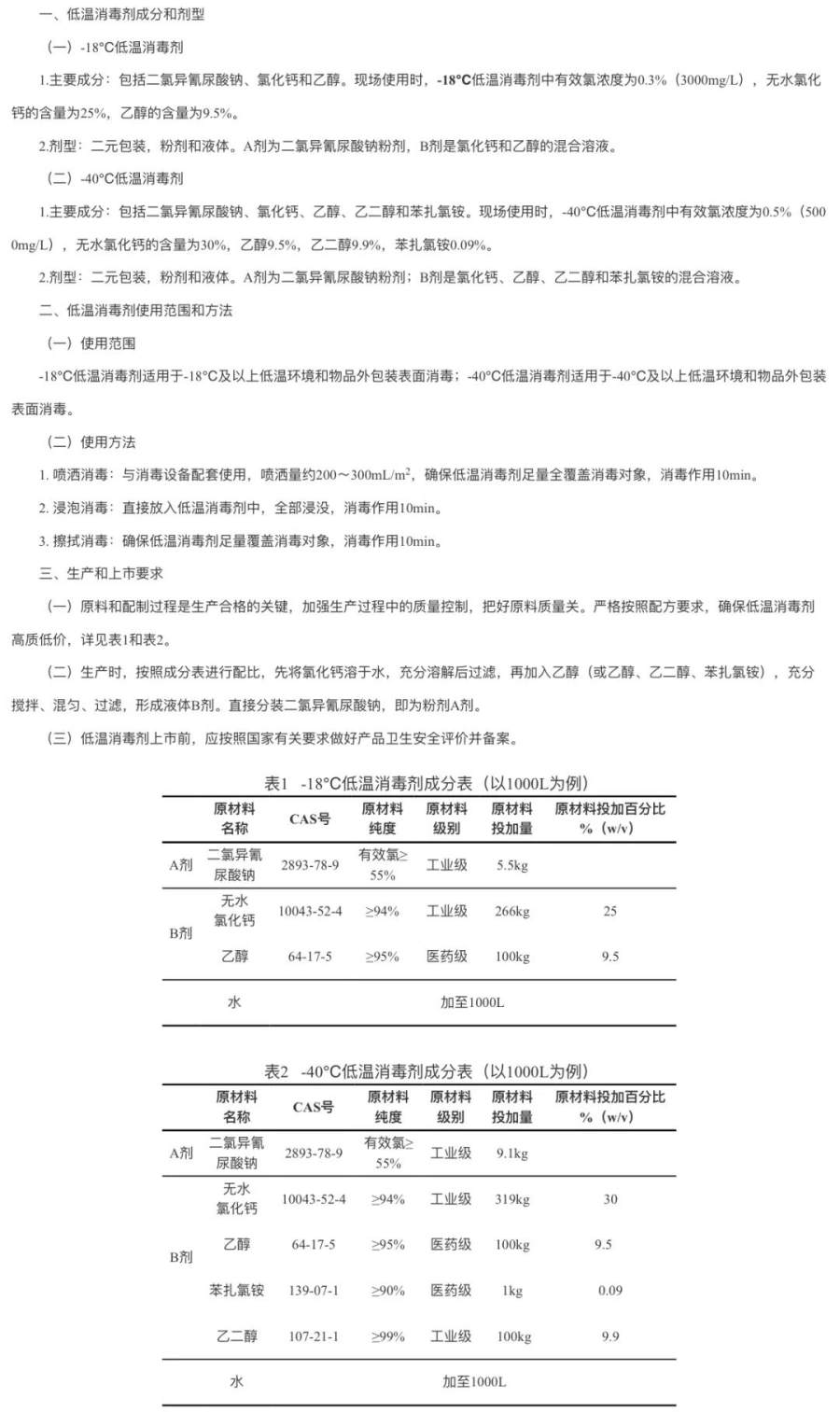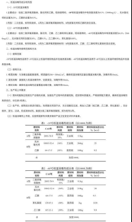 其中,“-18℃低温消毒剂”的主要成分是二氯异氰尿酸钠、氯化钙和乙醇。“-40℃低温消毒剂”的主要成分是二氯异氰尿酸钠、氯化钙、乙醇、乙二醇和苯扎氯铵。二者皆可通过喷洒消毒、浸泡消毒、擦拭消毒三种不同的方式起到消毒效果,消毒作用时间要求均为10分钟。