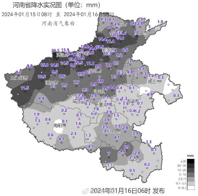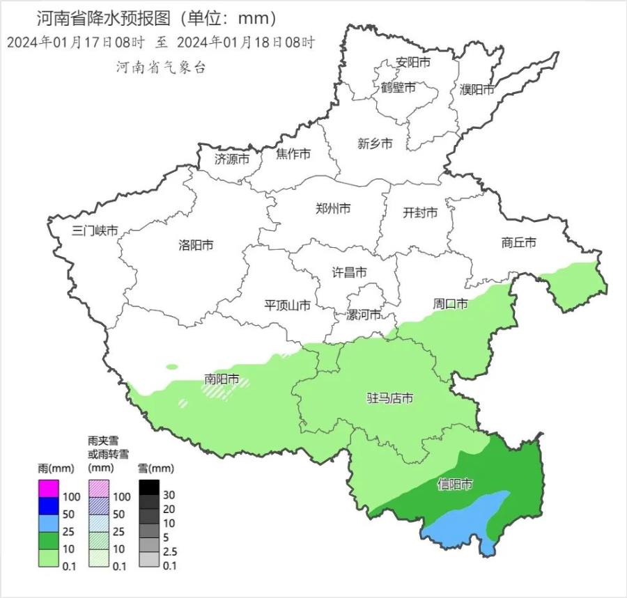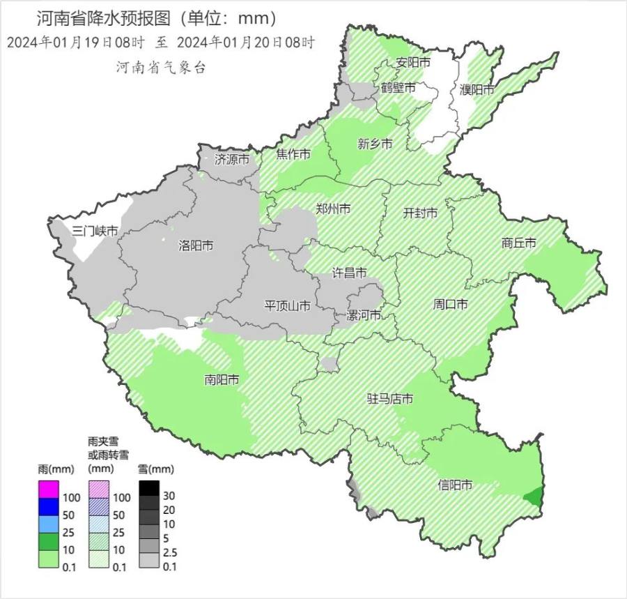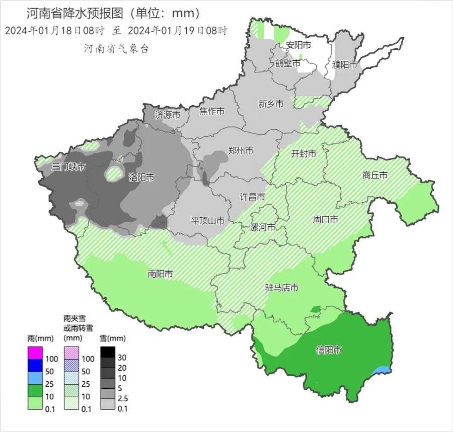 今天下午到夜里,黄河以北和三门峡、洛阳、郑州西部、平顶山西部、南阳西部有小到中雪;信阳、驻马店有小到中雨;其他县市有雨夹雪。