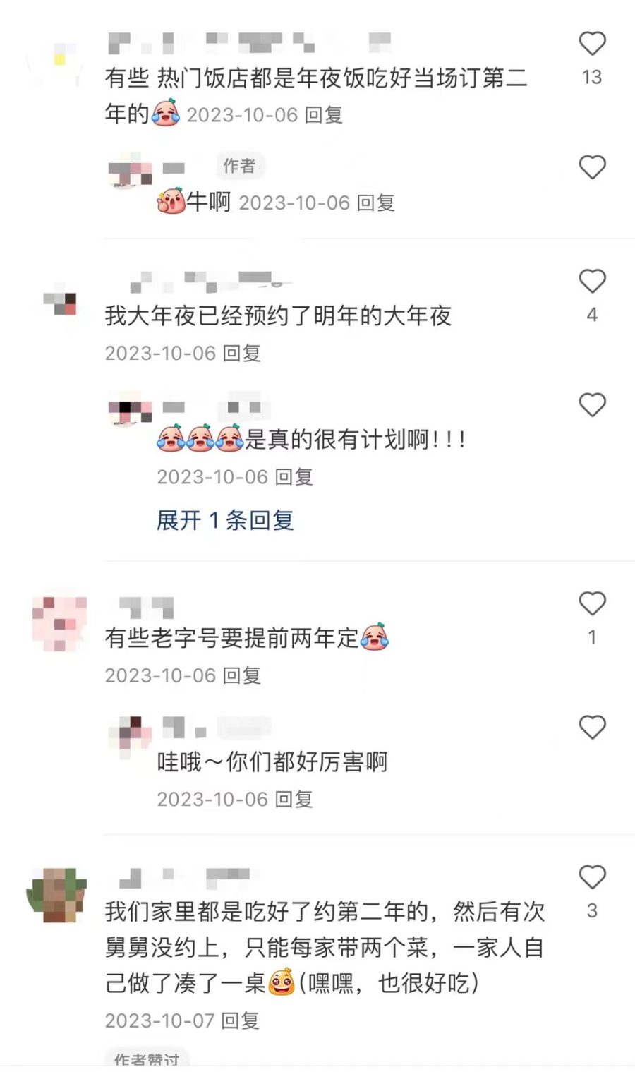 有人下手更早。记者注意到,在社交平台上,有不少网友称,自己提前一年就已经订好了年夜饭。“一般都是刚吃完今年的立马约明年的”“基本上都是提前一年订的”。
