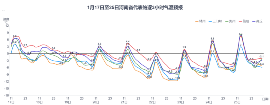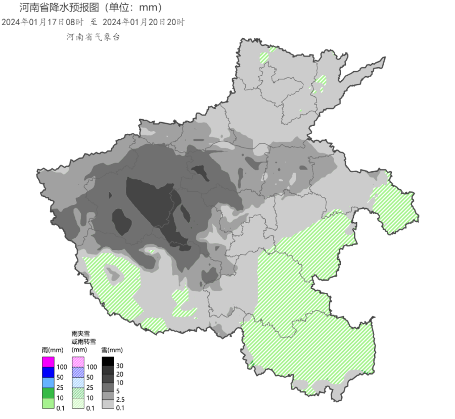 信阳有中雨,驻马店、南阳、三门峡南部、洛阳南部、平顶山南部有雨夹雪或小雪