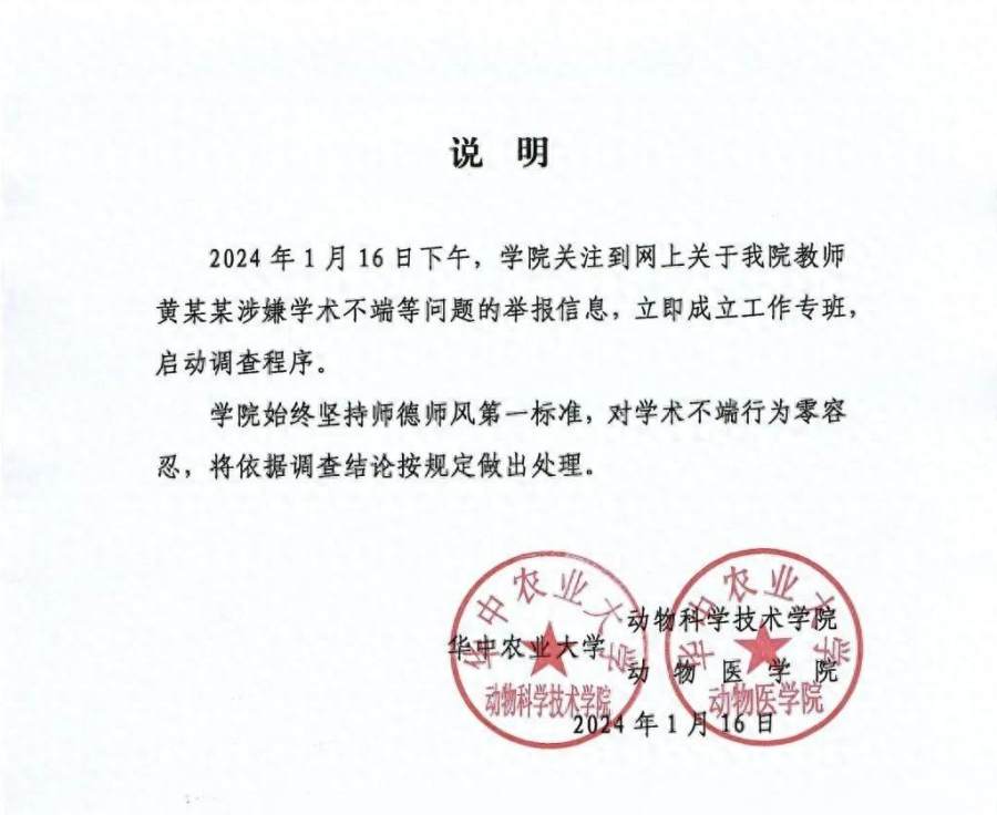 1月16日当晚,华中农业大学动物科学技术学院、动物医学院发布《说明》称,学院已成立工作专班,启动调查程序。学院始终坚持师德师风第一标准,对学术不端行为零容忍,将依据调查结论按规定作出处理。1月17日,华中农业大学党委宣传部工作人员告诉中国新闻周刊,目前学校正在调查此事,若有结果,将会第一时间公布。
