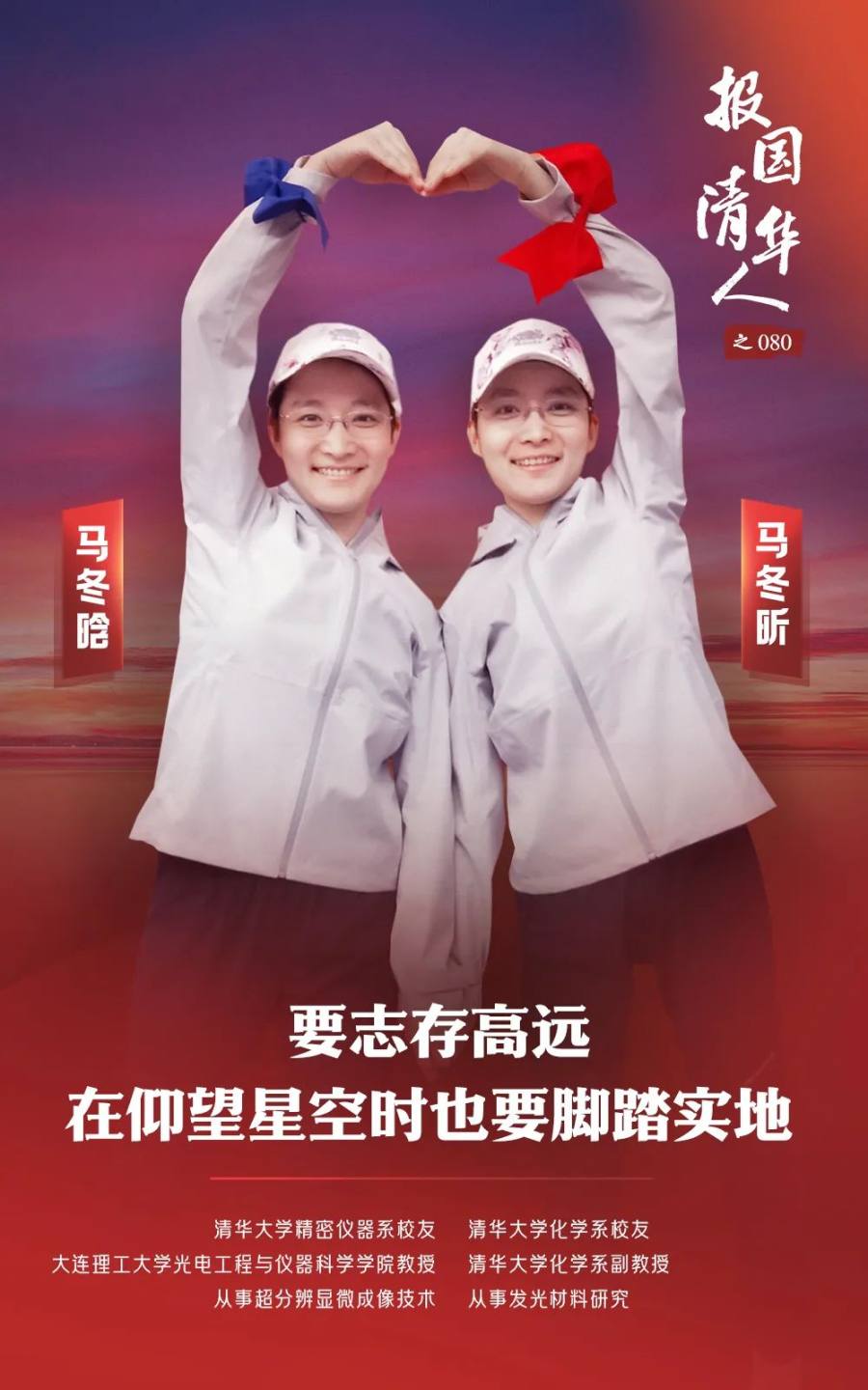 很多关键的科学问题以及面向国家乃至世界发展的重要需求有待于这一代科研工作者解决,而作为清华人,更要勇于承担这一代人的责任,从出发到回归,从马同学到马老师,马冬晗、马冬昕将继续在祖国大地上各自耕耘、并肩同行!