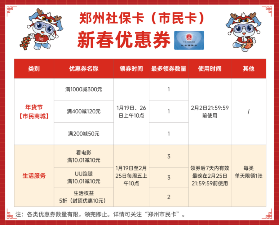 据了解,郑州社保卡(市民卡)本次新春惠民活动分为“焕新年货节”专场和“乐享生活节”专场,以发放优惠券的形式开开展。1月19日(明日)上午10点开始,郑州社保卡(市民卡)用户可通过“郑州市民卡”公众号领取50元、120元、300元不同面值的年货节【市民商城】优惠券,在线上购买相应价值的产品即可使用。另外,还有看电影、叫UU跑腿满10.01减10元,购买音视频会员、外卖打车券等权益打5折等多种优惠券,陪伴大家开心过年。