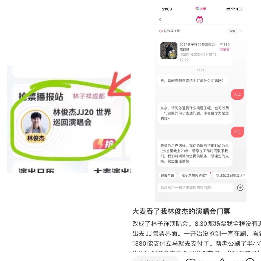 1月18日,“抢林俊杰演唱会付款后变成林子祥”登上微博热搜,有消费者在成功付款购买“林俊杰JJ20世界巡回演唱会-成都站”演唱会票后,发现出票的却是“2024林子祥50坚演唱会”,而林子祥演唱会就在购票的第二日,消费者质疑平台故意“跳票”,希望退款。