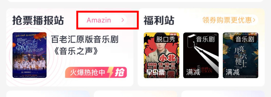 记者登陆大麦APP发现,“抢票播报站”的设置格式依然如此,比如,主图是百老汇原版音乐剧《音乐之声》,右上角则滚动“王晓佳”“Amazing”等词条,这些滚动词条均是平台正在热抢的门票。记者实测发现,即便误触,页面也不会跳转至对应词条的抢票页面,而是多场演唱会的信息,需要用户再手动点击“去抢票”,才能进入抢票页面。
