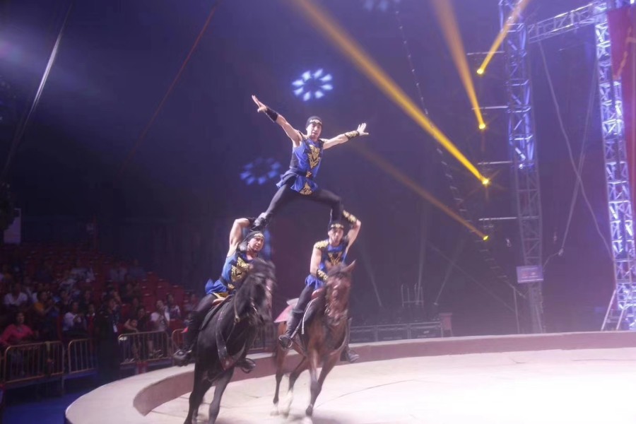 “在马术表演环节,演员们会在飞速奔跑的马背上展示出跳跃、穿越马跨、马上跳绳和站立等惊险刺激的杂技动作,不断增加难度,挑战极限,给观众带来真正的速度与激情。”曹青峰介绍说。