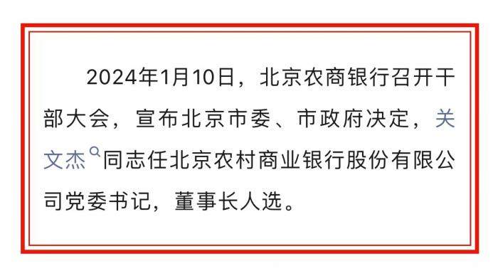 就在关文杰离开华夏银行后,他已成为北京农商银行董事长人选。北京农商银行官方微信公众号10日发文称,北京农商银行召开干部大会,宣布北京市委、市政府决定,关文杰任北京农村商业银行股份有限公司党委书记,董事长人选。
