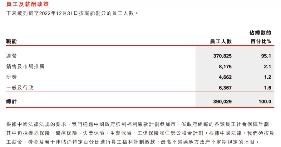 据京东物流2022年年报显示,运营员工的员工薪酬福利开支同比增长24.8%至446亿元,运营人员人数超37万人,占比超95%,其中京东拥有超过29万名自有配送人员。按上述数据粗略估算,2022年京东物流运营员工个人的薪酬福利平均超过12万元。