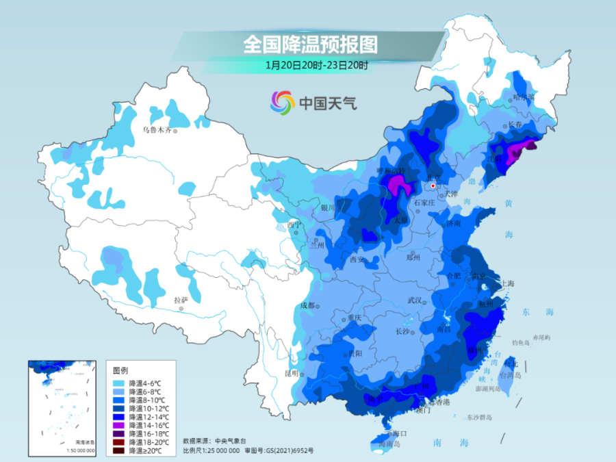 降温图冻紫了!寒潮发威中东部大部重回隆冬
