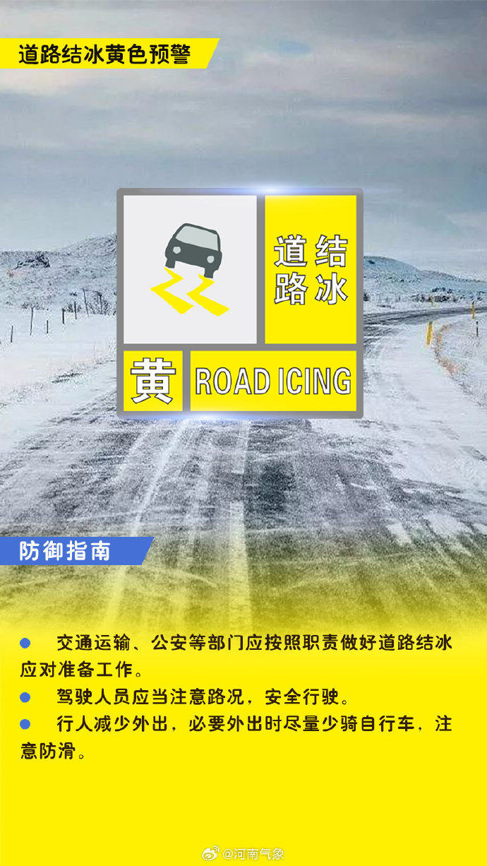 郑州市气象台2024年01月22日06时00分发布道路结冰黄色预警信号:受低温和降雪影响,预计今天早晨到夜里,郑州市主城区、航空港区、上街区所辖乡镇及街道路表温度低于0℃,将出现对交通有较大影响的道路结冰,请注意防范。