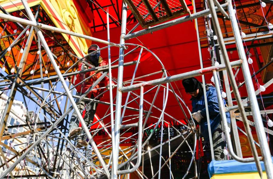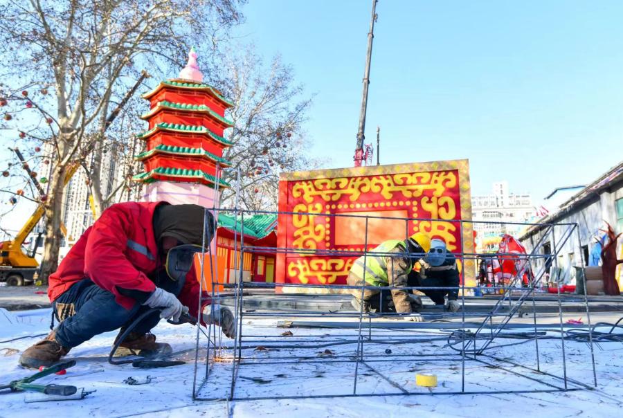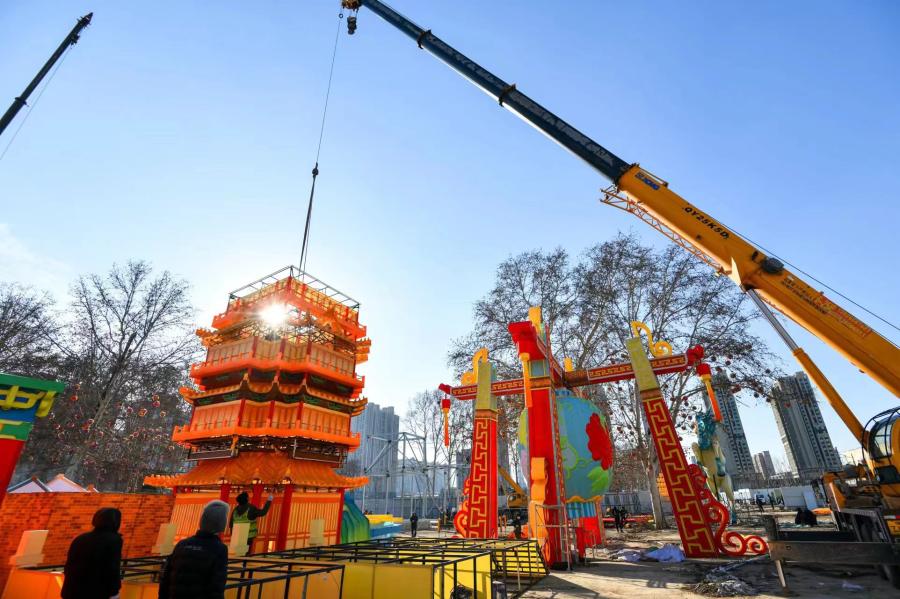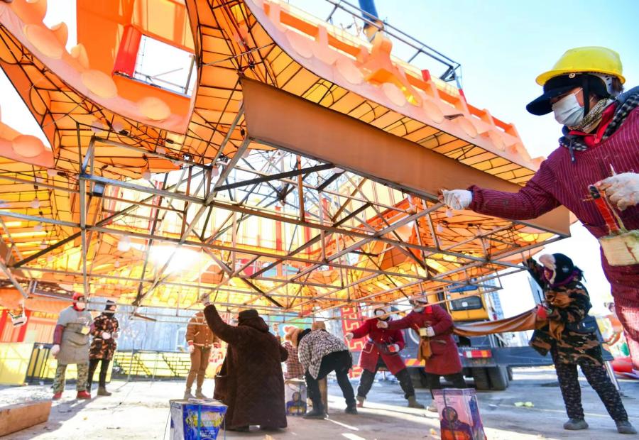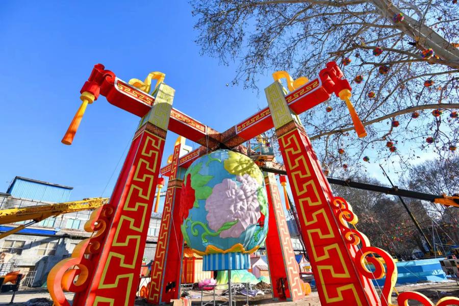从2023年12月28日起,60多位工匠就开始投入门灯的搭建工作,在近一个月的时间内,将这一长55米、高20米的巨型灯组从图纸变成现实。