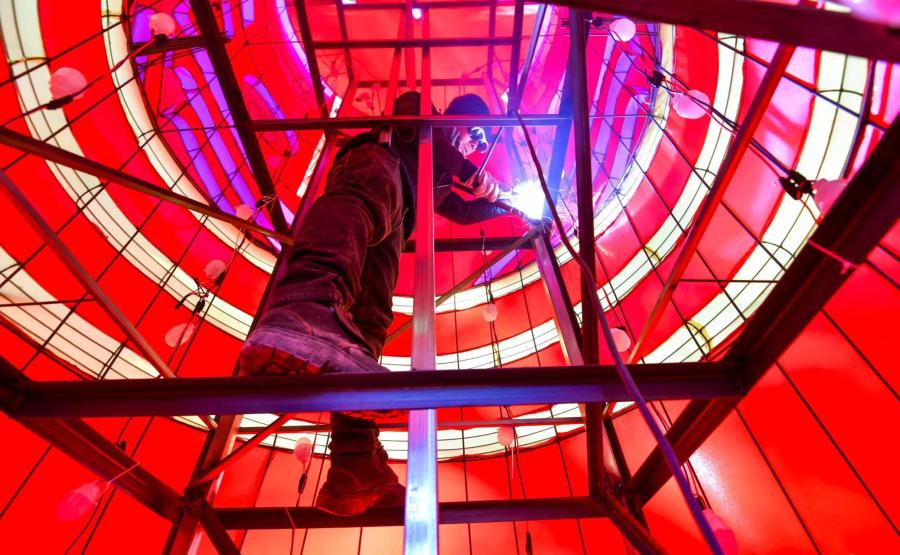 “每个工种既有分工上的区别,也要有工作上的相互配合。钳工在焊接时,就需要特别留意,给电工留下足够的灯源安装空间。”陈师傅表示,电工的工作主要是在灯组内部安装灯源,也就是“做内透”,在保障用电安全的情况下,尽可能完善整体的透光效果,确保灯组无黑暗死角。