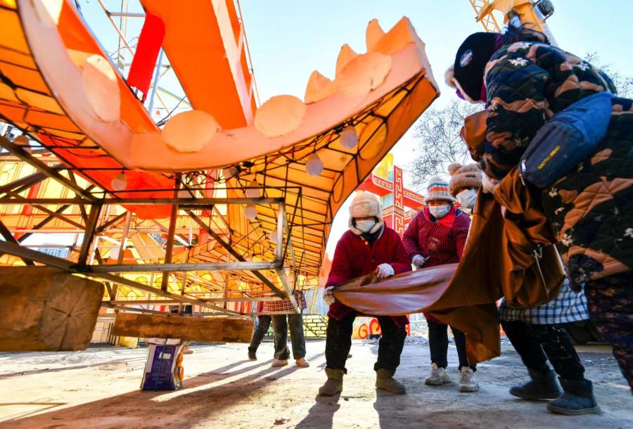 彩灯的内部工序完成后,工作重点就转移到了外部“包装”上来。裱糊工会根据设计图案和表现效果,将不同颜色的绸缎覆盖粘接在彩灯骨架上,并对细节部位的材料和颜色进行调整。最后,造型师还要对彩灯进行整体把关,一组彩灯才能够基本完工并呈现在观众面前。