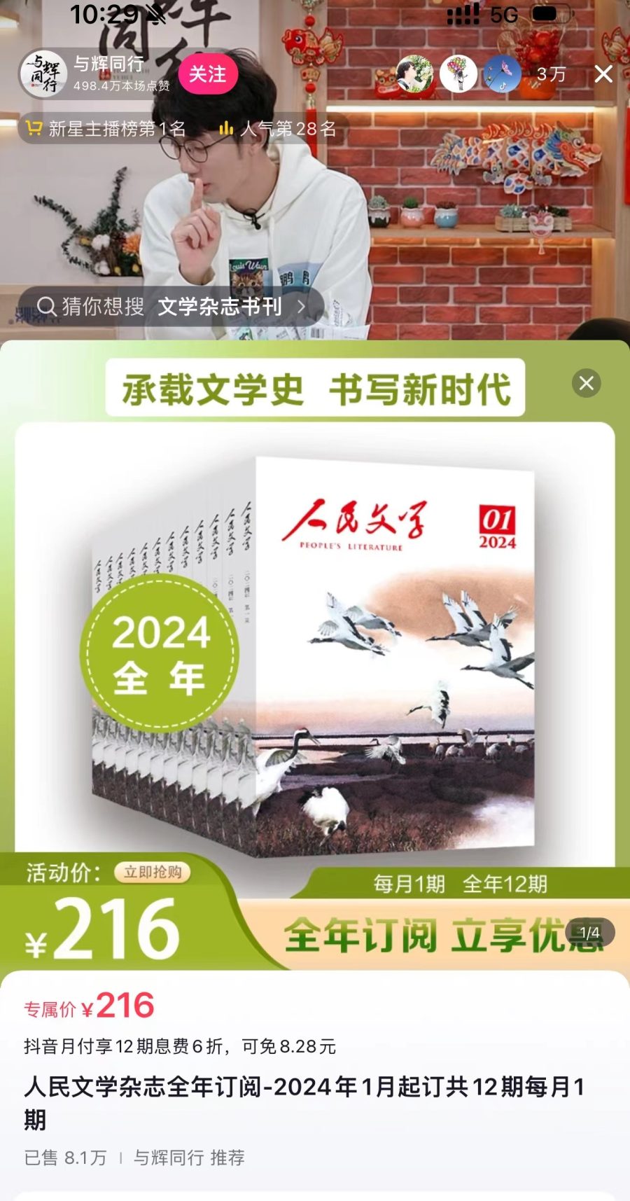 这是《人民文学》杂志的直播首秀,也是直播间首次“全程只卖一份文学杂志”。据记者查询,该场直播活动累计观看人数895万,最高同时在线70多万人,获得上亿次点赞,《人民文学》在董宇辉直播间的2024年全年订阅价为216元。