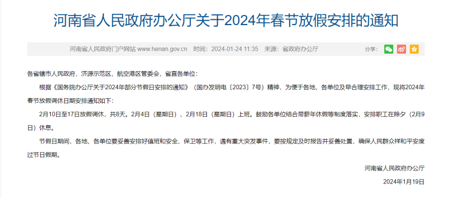 根据《国务院办公厅关于2024年部分节假日安排的通知》(国办发明电〔2023〕7号)精神,为便于各地、各单位及早合理安排工作,现将2024年春节放假调休日期安排通知如下: