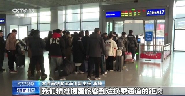 太原南站客运车间副主任 李静:太原南站增加了东便捷换乘通道,目前站内有东换乘通道、西换乘通道、重点旅客以及30分钟急客换乘通道。在每个出站通道,我们精准提醒旅客到达换乘通道的距离,实现最短距离不出站换乘。