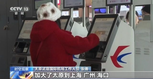 太原武宿国际机场工作人员 张倩:加大了太原到上海、广州、海口、博鳌、哈尔滨等航线的航班密度,不论是北方冰雪游,还是南方避寒游,根据情况适时更换宽体客机,满足旅客高峰出行需求。