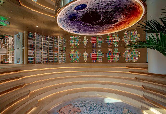 环抱式剧场内,“禹贡九州图”寓教于乐,呼应空间文脉中的“国”,即河洛古国,对应黄河中下游流域形成的中原城市群雏形的历史考证,与文脉黄河首尾呼应。还有提取了大河村彩陶文化的代表性文物彩陶双连壶形状的异型书架,为空间注入独特的历史人文气息。