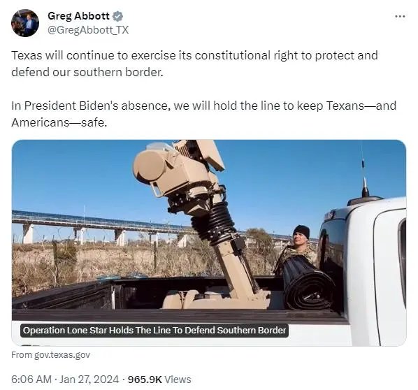 根据阿博特方面的说法,对位于美国南部边境的得州而言,放任移民入境会对当地社会生活与治安造成严重影响。阿博特多次抨击拜登“破坏了联邦和各州之间的契约”,因为按照法律,美国各州有权在“遭遇入侵”时采取自卫手段。