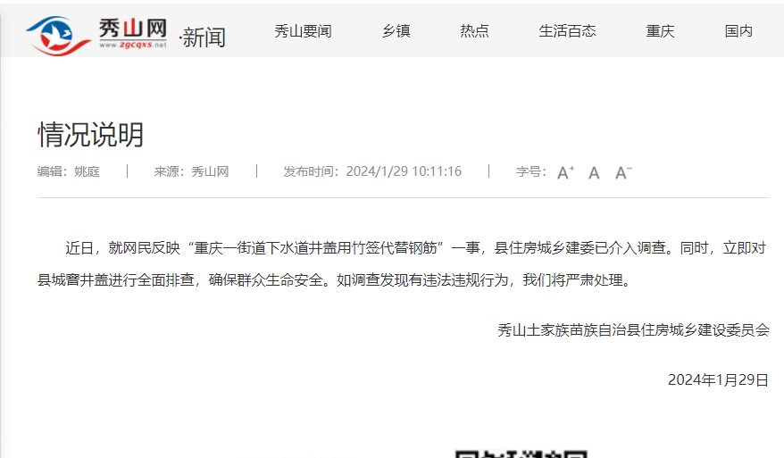 1月29日,重庆秀山土家族苗族自治县住房城乡建设委员会发布情况说明称,近日,就网民反映“重庆一街道下水道井盖用竹签代替钢筋”一事,县住房城乡建委已介入调查。同时,立即对县城窨井盖进行全面排查,确保群众生命安全。如调查发现有违法违规行为将严肃处理。