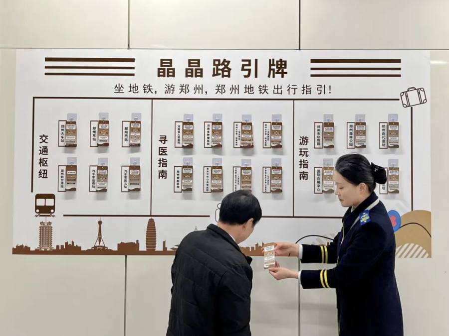 车站C、D口张贴有“晶晶路引牌”,包含交通枢纽、寻医指南、游玩指南三大板块,为来郑游客提供出行参考。