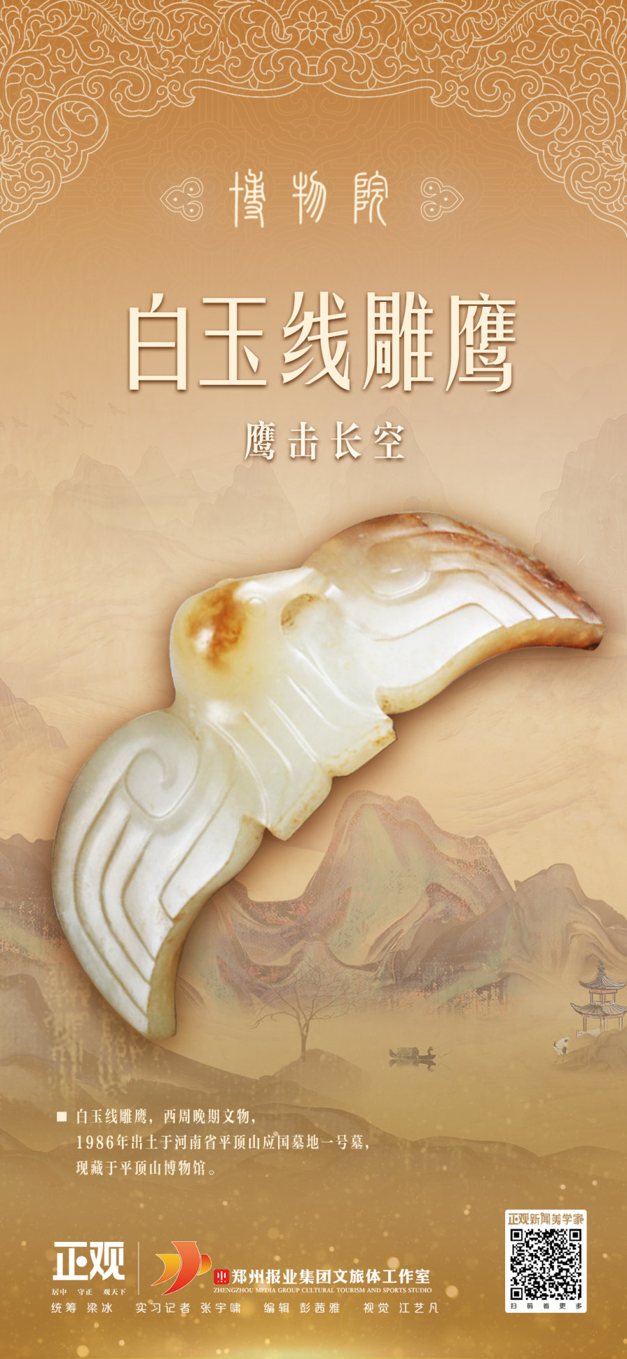 白玉线雕鹰,西周晚期文物,玉器,长2.2厘米,宽5.7厘米,重16克,1986年出土于河南省平顶山应国墓地一号墓,现藏于平顶山博物馆。墓主人当是应国最后一位国君,而一号墓出土的这件玉鹰,当是墓主人应侯的随身佩玉。其玉料呈白色,略泛青,温润光洁,微透明。鹰头顶和右翅有褐斑,当是有意运用“俏色”手法就势雕琢而成的。