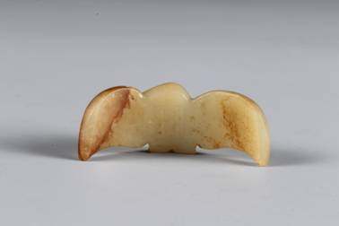 鹰作展翅飞翔状,头向右扭曲,以嘴衔右翅,形成一个穿孔。双翅前端亦各有一个小穿孔,鹰眼、鹰背、羽翅均为线雕。两爪作长条形,卷曲于身下。头部用高浮雕的手法雕刻,身体则用平雕的手法雕成拱形。形象逼真,栩栩如生,用写真的手法创作了这一形神兼备的展翅雄鹰。