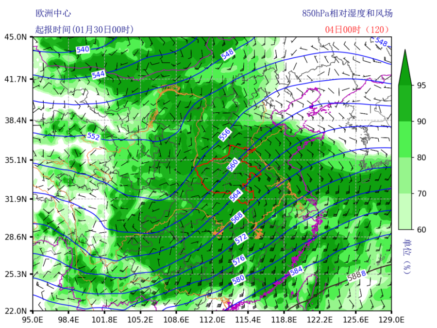 2月4日850hPa相对湿度和风场预报