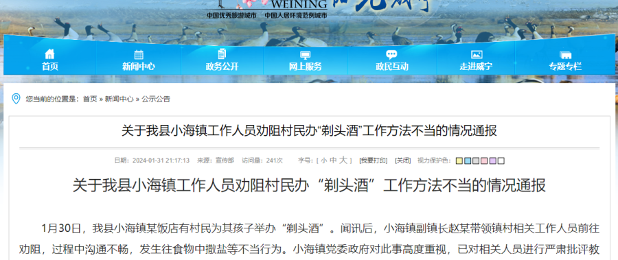 据贵州毕节威宁县政府新闻办公室1月31日晚通报:1月30日,我县小海镇某饭店有村民为其孩子举办“剃头酒”。闻讯后,小海镇副镇长赵某带领镇村相关工作人员前往劝阻,过程中沟通不畅,发生往食物中撒盐等不当行为。小海镇党委政府对此事高度重视,已对相关人员进行严肃批评教育,并要求作出深刻检讨。相关人员已于31日向村民致歉,并获得谅解。