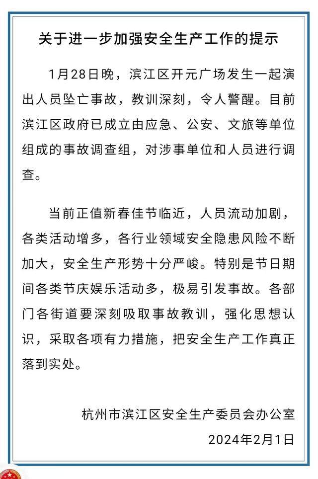 2月1日晚,@滨江发布 微博通报,关于杭州一女子高空杂技表演时坠落身亡,滨江区官方回复如下: