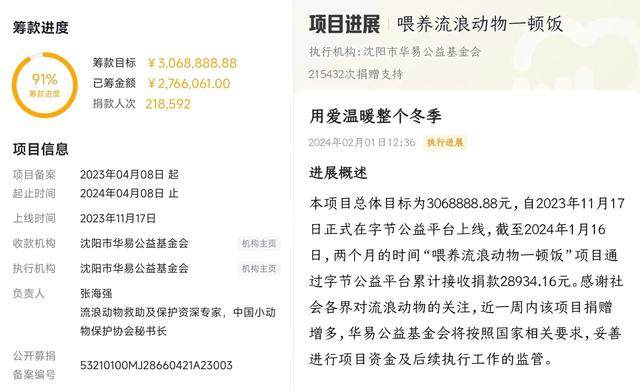 2月1日12时36分,由中国小动物保护协会秘书长张海强为责任人的“喂养流浪动物一顿饭”项目,在筹款平台发布项目进展,截至2024年1月16日,项目累计接收捐款28934.16元。“近一周内该项目捐赠增多,华易公益基金会将按照国家相关要求,妥善进行项目资金及后续执行工作的监管。”
