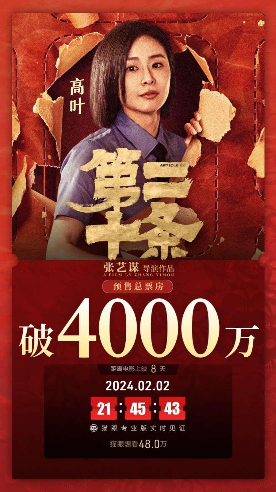 截至2月2日21时45分许,《第二十条》预售已突破4000万元