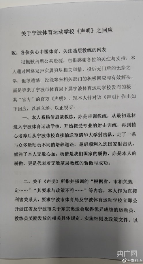 很抱歉占用公共资源,也很感谢各位的关注与支持,本人通过网络发声实属穷尽相关举措、投诉无门后的无奈之举,但很遗憾,没能等来相关部门的积极回应与有效解决,而是等来了宁波市体育局下属宁波体育运动学校发布的极其“官方”的官方《声明》,现本人针对该《声明》作出如下回应,以表立场、以正视听: