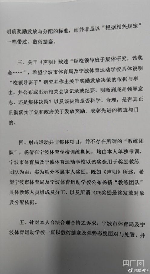 四、射击运动并非集体项目,并不存在所谓的“教练团队”,杨倩在宁波体育学校训练期间,均由本人单独带训,宁波市体育局及宁波体育运动学校以该奖金用于奖励教练团队为由,实为瓜分本属本人奖励。既如《声明》所述,希望宁波市体育局及宁波体育运动学校公布杨倩“教练团队”具体教练人员组成及分工,以及所谓40%奖励最终发放对象及分配依据。