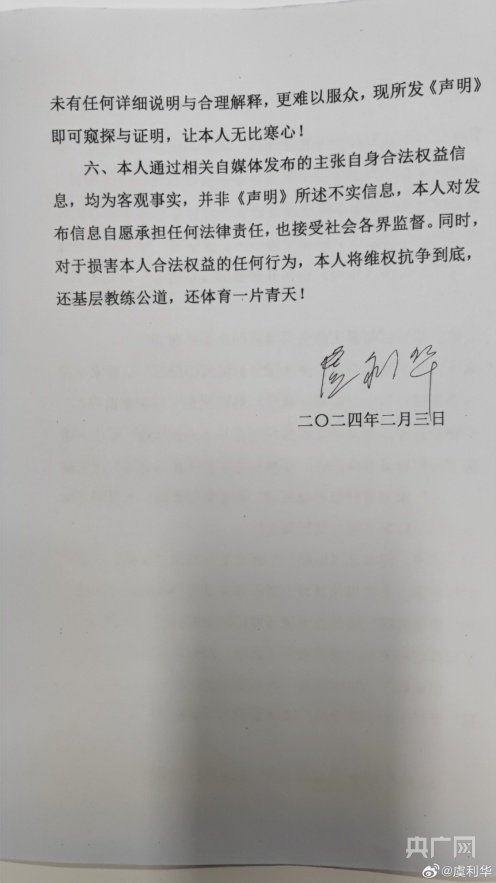六、本人通过相关自媒体发布的主张自身合法权益信息,均为客观事实,并非《声明》所述不实信息,本人对发布信息自愿承担任何法律责任,也接受社会各界监督。同时,对于损害本人合法权益的任何行为,本人将维权抗争到底,还基层教练公道,还体育一片青天!