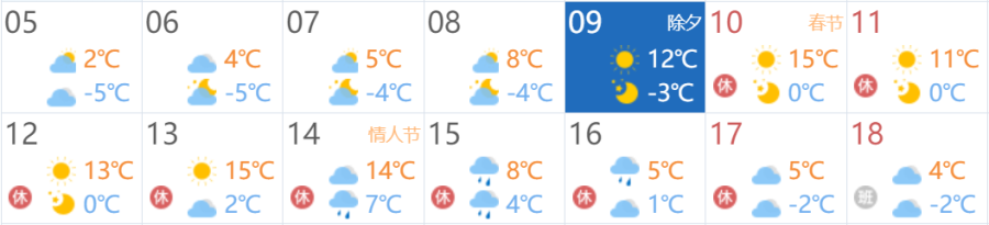 年前有望升温吗?雨雪即将告一段落,低温却未结束。5-7日最低气温黄淮之间零下12度到零下10度,西部山区局部零下15度到零下13度,其他县市零下8度到零下5度。5日全省气温开始缓慢回升,除夕(9日)气温明显回升,预计全省大部将以10度+小温暖迎接龙年第一天。