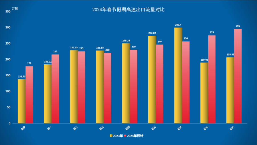 2024年的春节假期与往年有所不同,是史上最长的春节假期。预计春节前全社会跨区域人员流动量将创历史新高。探亲流、学生流、务工流、旅游流高位叠加,运输服务保障任务更加繁重。自驾出行占比也将创历史新高,叠加春节假期免收小客车通行费时长增加等因素,高速公路、普通国省干线公路、服务区等运行压力较大。预计今年春节期间我省高速公路出口总流量将稳定增长,9天车流量将达到2140万辆左右,较2023年同期同比增长约8%,日均流量约238万辆,为日常流量的1.6倍。其中,2月17日(正月初八)将达到流量最高峰,预计当天流量将突破290万辆。