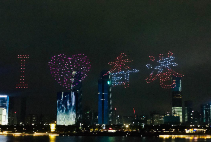 2019年8月11晚,深圳湾上空600架无人机组合拼出爱国爱港标语(图源:人民网)