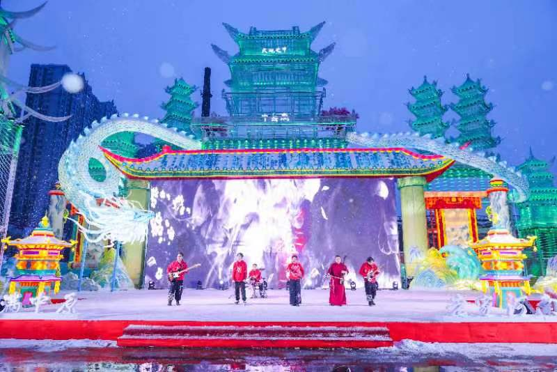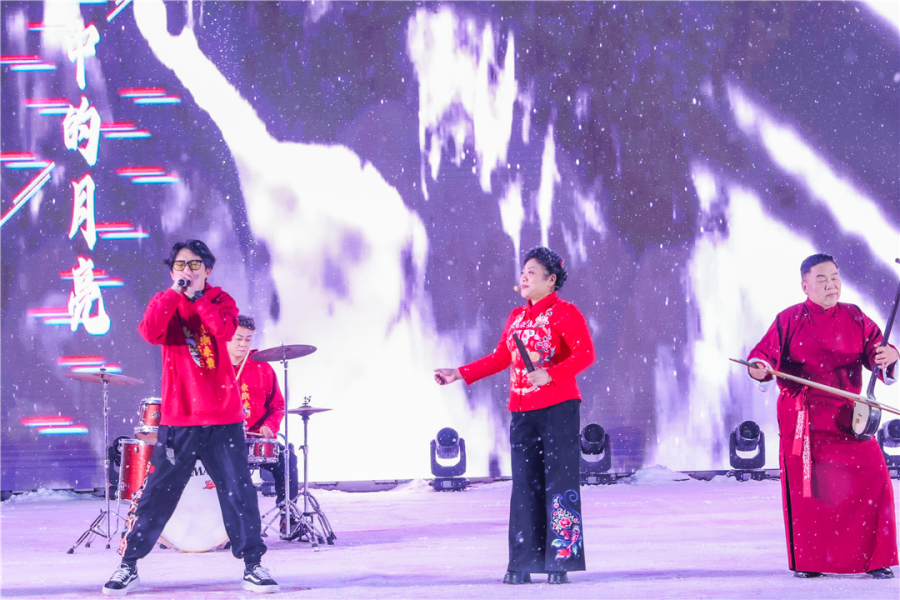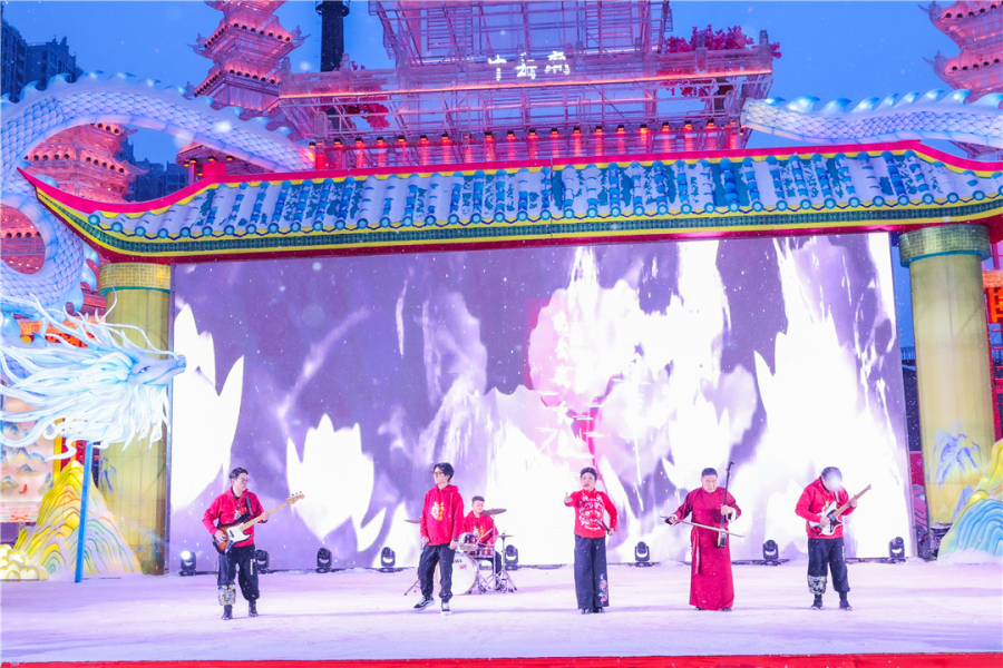 开幕式现场,非遗国潮乐队在大雪纷飞中以一曲艺摇滚《最美的月亮》点燃现场观众热情