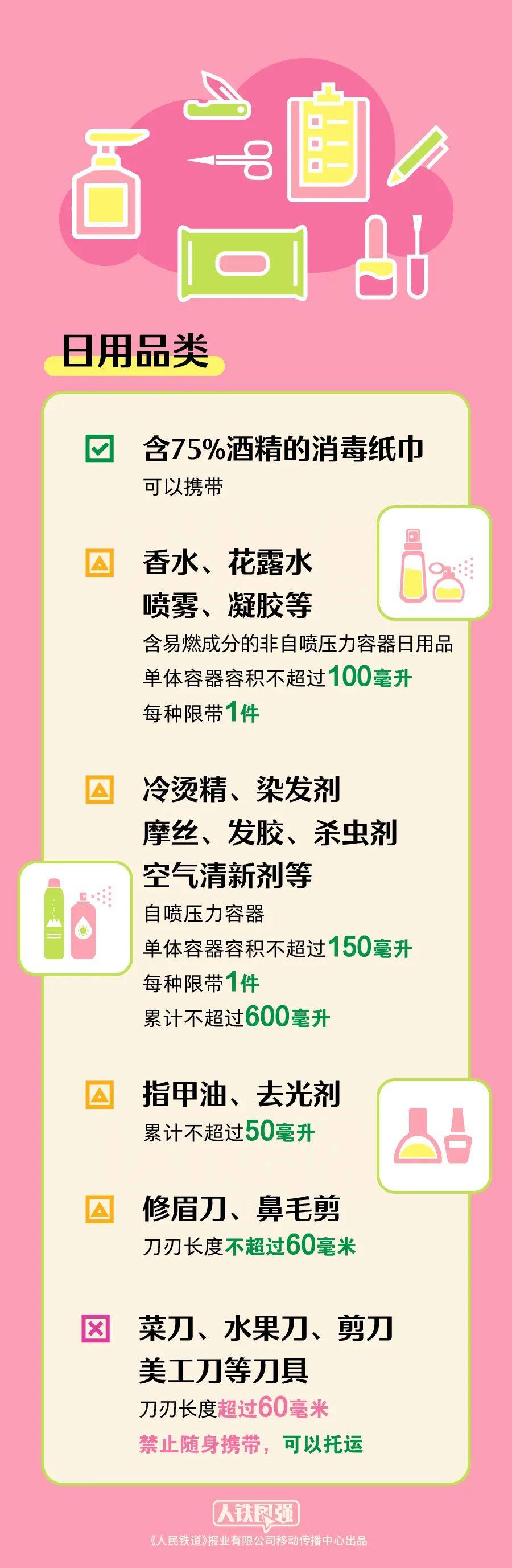花露水、香水、消毒凝胶等含易燃成分的非自喷压力容器日用品,单瓶不得超过100毫升,每种限带1件。