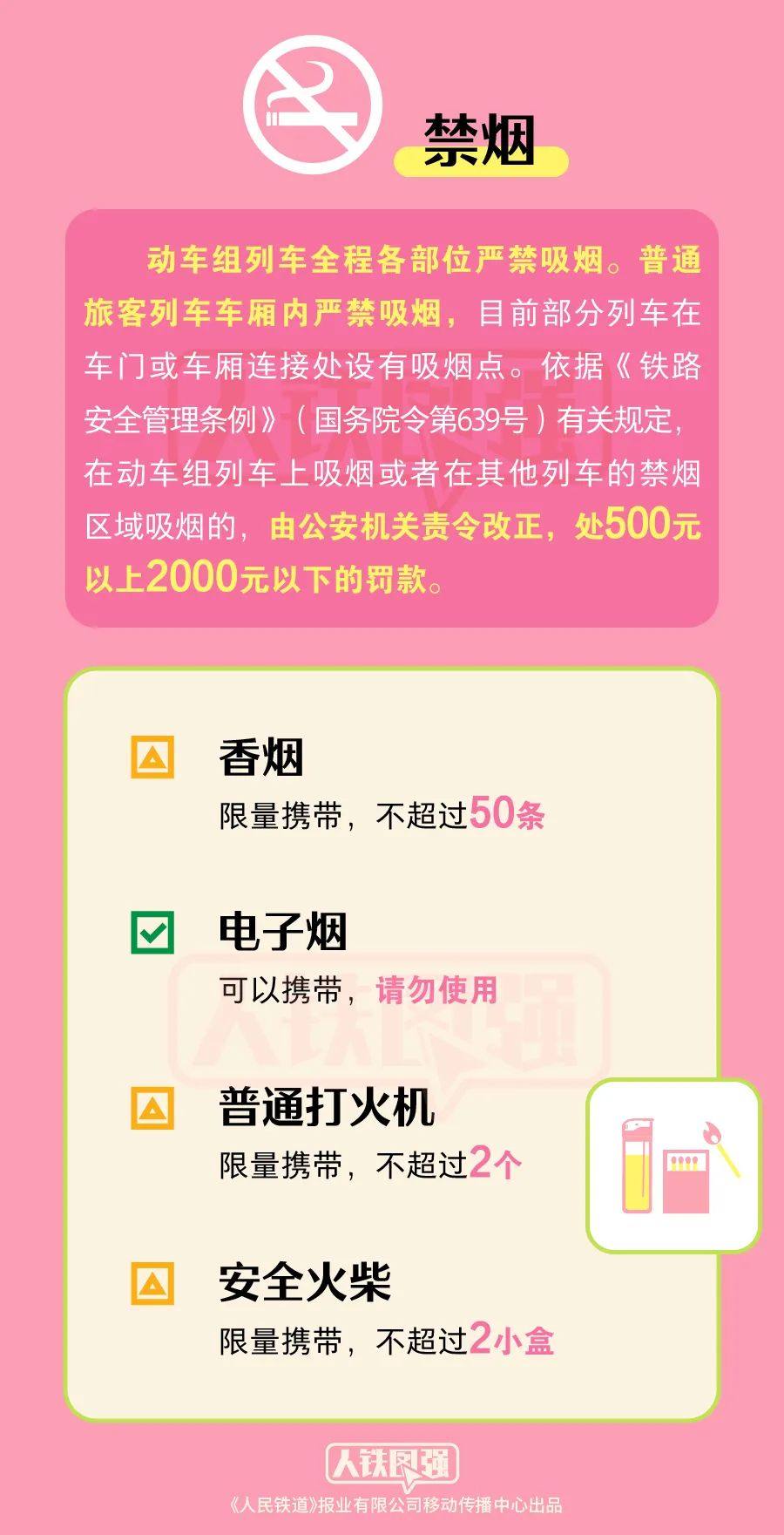 注意 :打火机油是禁止携带的。同时,动车组列车全列禁烟,请勿在车厢任何处所吸烟,电子烟也不可以。