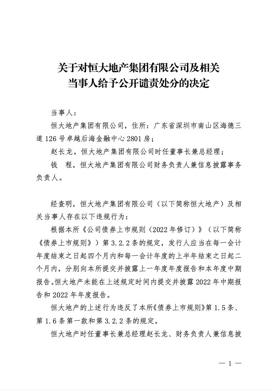 二、对恒大地产集团有限公司时任董事长兼总经理赵长龙、 财务负责人兼信息披露事务负责人钱程给予公开谴责的处分。
