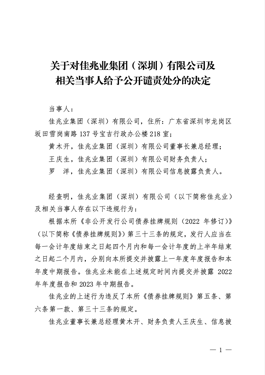 一、对佳兆业集团(深圳)有限公司给予公开谴责的处分;
