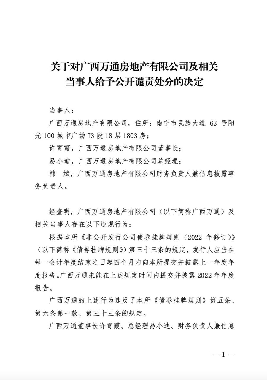 同日,深交所发布关于对广西万通房地产有限公司及相关当事人给予公开谴责处分的决定。