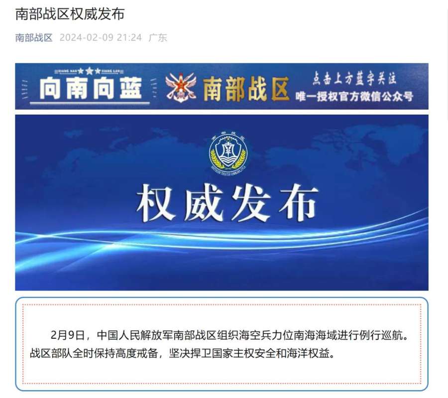 2月9日,中国人民解放军南部战区组织海空兵力为南海海域进行例行巡航。战区部队全时保持高度戒备,坚决捍卫国家主权安全和海洋权益。