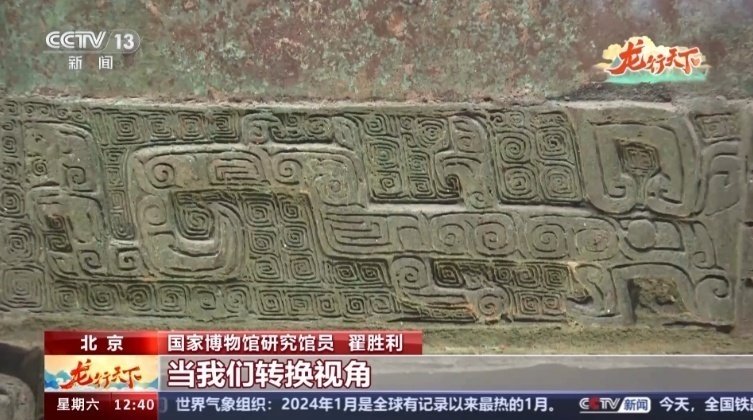 国家博物馆研究馆员 翟胜利:后母戊鼎上的龙纹是非常特殊的,在每一个面上,我们都可以看到两条直立向上的龙。当我们转换视角,走到两条壁相交的转角处的时候,能够发现,其实两条龙纹又共同构成了一个兽面纹,这些兽面纹、龙纹承载的是向神灵传达祭祀者的诉求来和神灵沟通,表达诉求的一种重要的媒介作用。